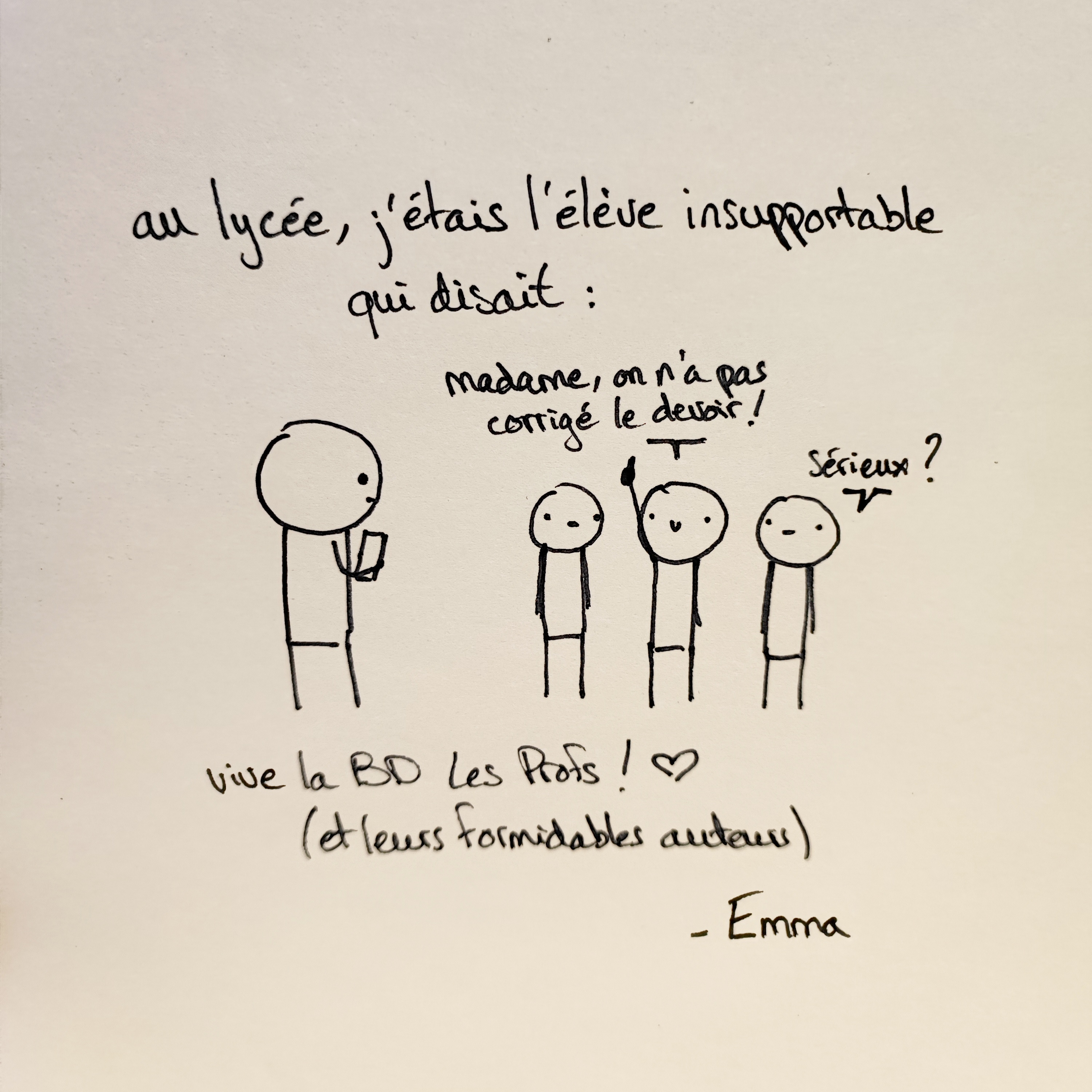 J’ai l’impression que c’était hier. Cette fois où allant lire dans le coin BD du CDI de mon collège, la documentaliste me présente une BD franchement arrivée et réceptionnée. C’était en 2000, il y a 25 ans, le premier album des Profs « interro surprise »! La série est devenue pour moi un plaisir, un moment de rire et d’exaltation, une sortie d’album à ne pas rater et surtout un personnage emblématique savoureux Polochon, au point d’avoir fini par suivre ses pas en classe et d’en faire mon métier. J’ai eu la chance et le privilège de pouvoir rencontrer et connaître les auteurs et personnes qui font cette série. C’est une grande fierté que je n’aurai jamais imaginée 25 ans en arrière.